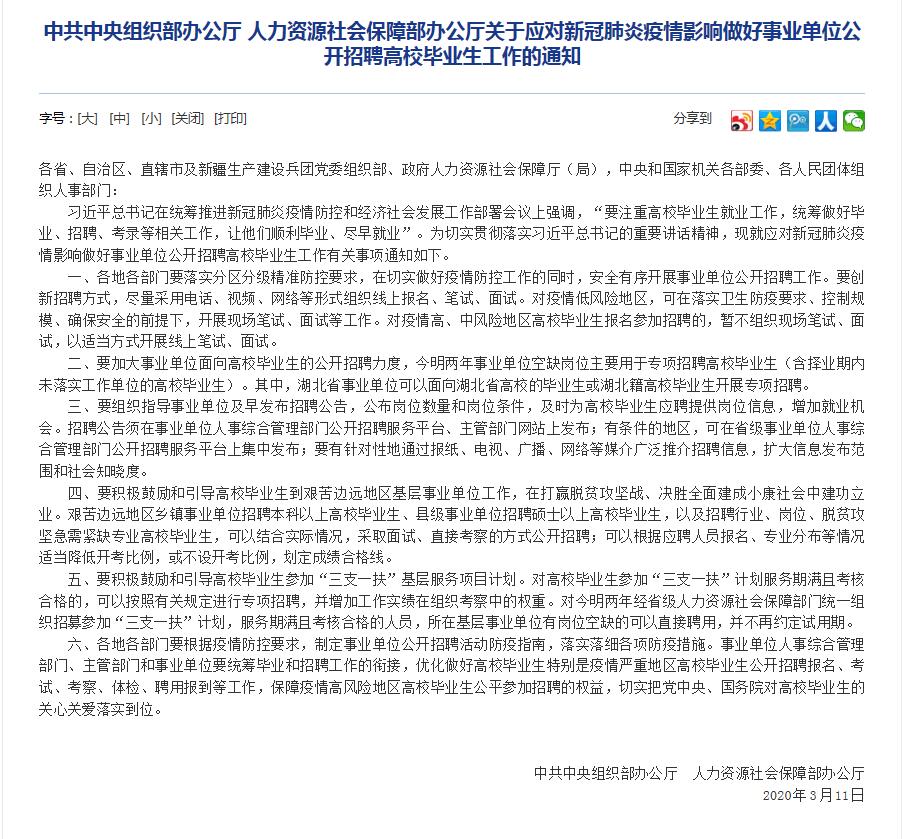 習(xí)近平總書記在統(tǒng)籌推進新冠肺炎疫情防控和經(jīng)濟社會發(fā)展工作部署會議上強調(diào),“要注重高校畢業(yè)生就業(yè)工作,統(tǒng)籌做好畢業(yè)、招聘、考錄等相關(guān)工作,讓他們順利畢業(yè)、盡早就業(yè)”。為切實貫徹落實習(xí)近平總書記的重要講話精神,現(xiàn)就應(yīng)對新冠肺炎疫情影響做好事業(yè)單位公開招聘高校畢業(yè)生工作有關(guān)事項通知如下。