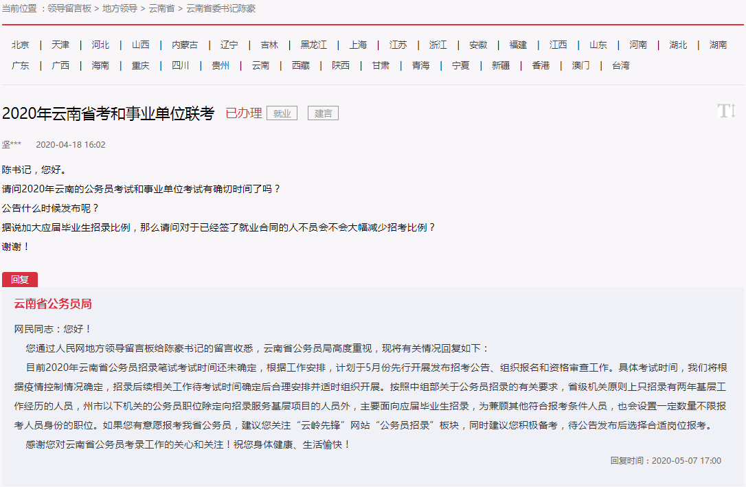 受疫情影響,2020年各類考試都推遲進(jìn)行,在就業(yè)嚴(yán)峻的情況下,眾多考生非常關(guān)注2020云南省考何時開始。近日,在“人民網(wǎng)領(lǐng)導(dǎo)留言板”欄目中云南省公務(wù)員局就何時開展2020省考進(jìn)行了答復(fù),具體內(nèi)容如下: