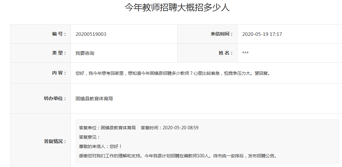 答復(fù)單位:固鎮(zhèn)縣教育體育局 答復(fù)時(shí)間:2020-05-20 08:59