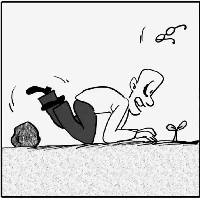 2、漫畫題:一個(gè)人被一塊石頭絆倒,眼鏡跌飛,眼睛緊盯著一個(gè)小樹苗。(如下圖)