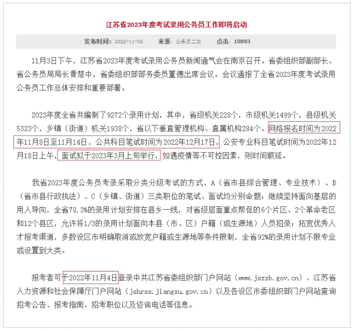 2023江蘇公務(wù)員考試消息已出,快來查收重要信息:招錄人數(shù):9272人,其中,省級機關(guān)228個,市級機關(guān)1499個,縣級機關(guān)5323個,鄉(xiāng)鎮(zhèn)(街道)機關(guān)1938個,省以下垂直管理機構(gòu)、直屬機構(gòu)284個。