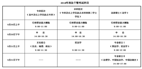 以下為2014年政法干警招錄考試科目及時間安排: