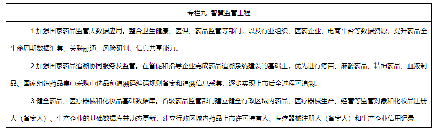 1.建立健全藥品信息化追溯體系。落實(shí)藥品上市許可持有人追溯主體責(zé)任。完善藥品信息化追溯體系,構(gòu)建國(guó)家藥品追溯協(xié)同服務(wù)和監(jiān)管體系,推進(jìn)藥品追溯信息互通共享,實(shí)現(xiàn)重點(diǎn)類別藥品全過程來源可溯、去向可追。逐步實(shí)施醫(yī)療器械唯一標(biāo)識(shí),完善醫(yī)療器械唯一標(biāo)識(shí)數(shù)據(jù)庫,加強(qiáng)在上市后監(jiān)管、醫(yī)療管理、醫(yī)保管理等領(lǐng)域的銜接應(yīng)用。